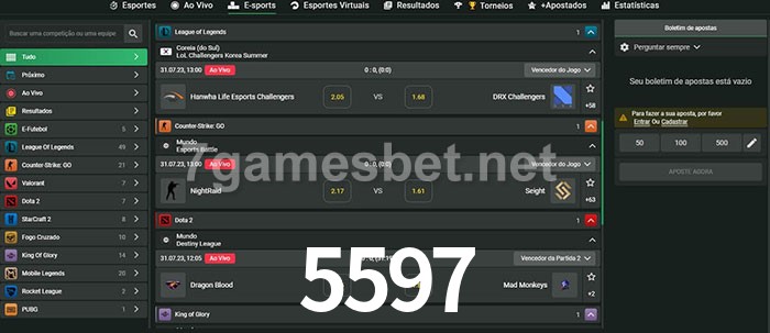 O 5597 oferece uma grande seleção de opções de apostas em e-sports com probabilidades competitivas
